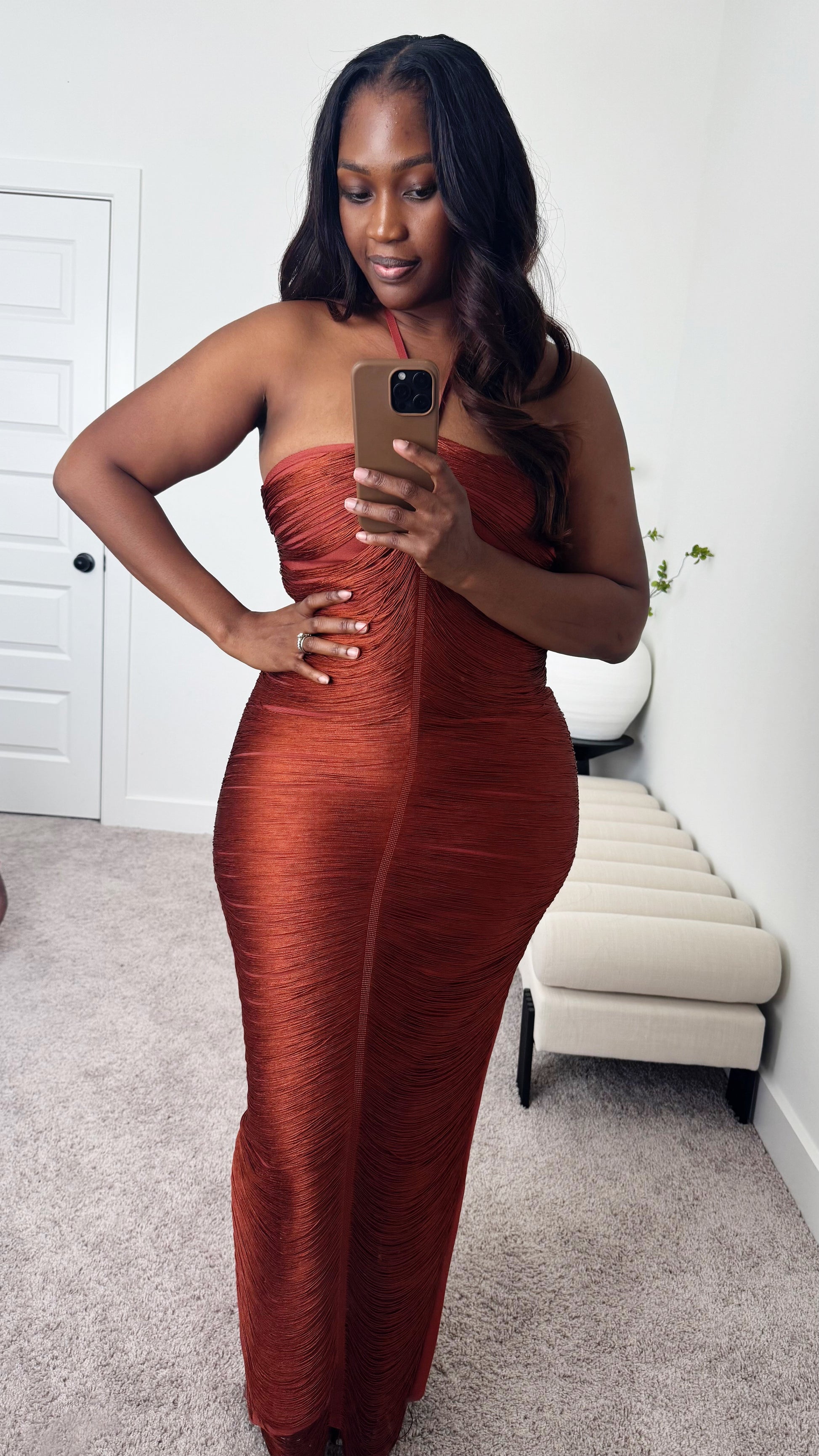 Burnt orange bandage dress with Fringe